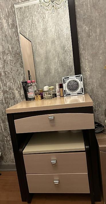 - Tualet masası güzgü ilə: iri vertikal güzgü, üst hissə açıq bej rəngdə, tünd konturlar. Yuxarıda 1 çekmece, ortada açıq rəf/sürgülü panel, aşağıda 2 çekmece.
