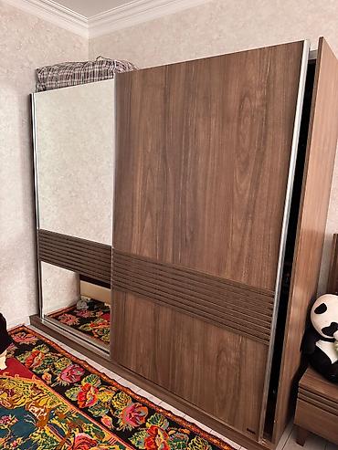 - Sürgülü qapılı qardirob: bir tərəfi geniş güzgülü, ağac teksturalı ön panel, alüminium relslər və dekorativ üfüqi xətəli zolaqlar. Daxildə rəflər və asılqan bölmələri üçün geniş yer (şəkillərdə görünür).
