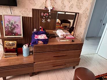 - Tualet masası/komod: geniş masaüstü, iri güzgü, çoxsaylı saxlama üçün 2 iri çekmece və yan rəf bloku. Eyni üslubda taxta faktura və dekorativ xətlər.