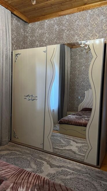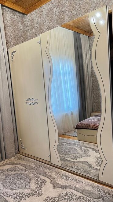 - 3 qapılı dolab: ortada böyük güzgülü sürgülü qapı, kənarlarda bəzək elementləri. Geniş saxlama üçün rəflər və asılqan bölmələri (şəkildən görünür).