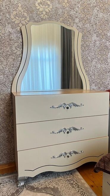 - Güzgülü komod: 3 geniş çəkməcə, üst hissədə iri dekorativ çərçivəli güzgü.
