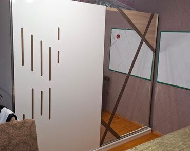 - Geniş pəncərə güzgülü paltar dolabı: sürgülü qapılar, bir tərəfi ağ dekor kəsikləri ilə, digər tərəfi böyük güzgü panellidir.
