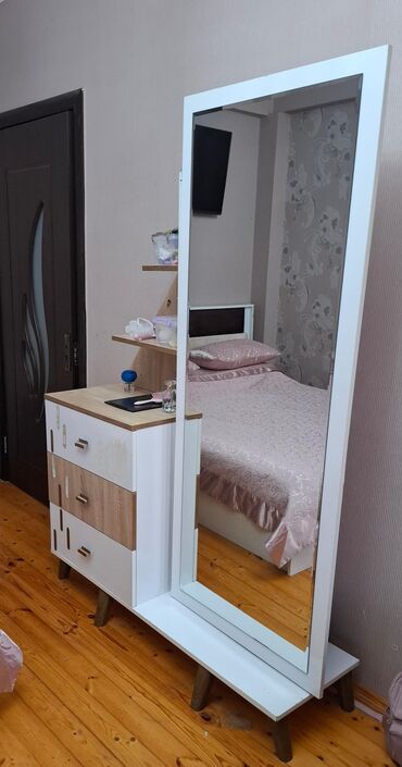 - Tualet masası/güzgülü konsol: ağ–ağac rəngli kombinasiya, üç siyirmə, yuxarıda açıq rəf, tam ölçülü dikduran güzgü və dayanıqlı ayaqlar.
