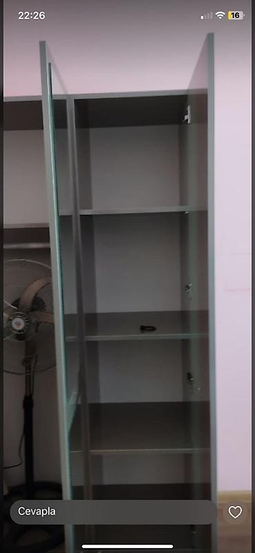 - Şkaf: iki qapılı, rəfli daxili quruluş. Bir neçə hündürlükdə geniş rəflər saxlamanı asanlaşdırır. Qapılar şüşə panellə vurğulanıb, metal menteşələr və tutacaqlar mövcuddur.