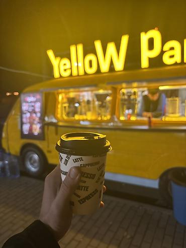 Sarı rəngli, neon işıqlarla bəzədilmiş mobil food-truck. Üstündə “Yellow Park” işıqlandırması var. Yan pəncərədən servis edilir; içəridə içkilər və sous dispenserləri, qəhvə aparatları və hazırlıq ...