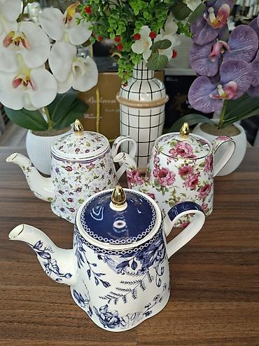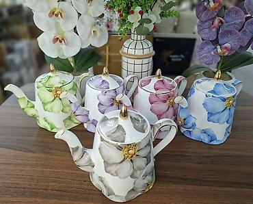 Porselen çaydanlar – dekorativ çiçək naxışları və qızılı detallarla