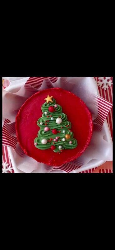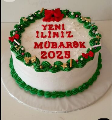 - Şən dizaynlar: qırmızı glaçlı üstü yaşıl krem ilə bəzədilmiş “şam ağacı” dekoru; ağ mastika/kremlə örtülü, yaşıl naxışlarla çevrələnmiş və “Yeni iliniz mübarək 2025” yazılı variant.