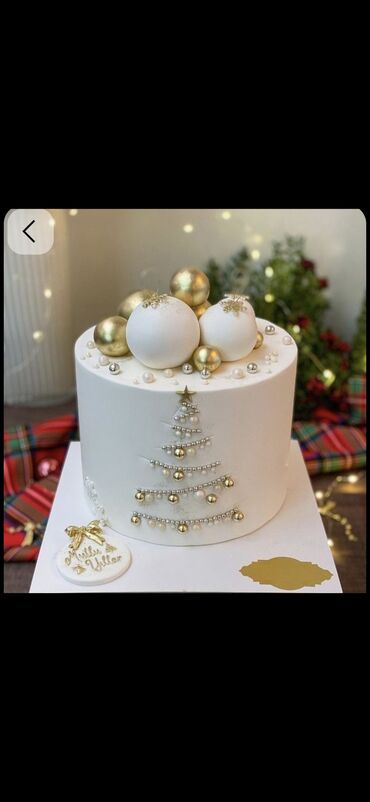 - Zərif dizayn: Ağ mastiklə örtülü silindrik tortun üzəri mirvari və qızılı dekorlarla bəzədilib. Ön hissədə qızılı-mirvari muncuqlarla “şam ağacı” kompozisiyası, üstündə isə müxtəlif ölçülü qızılı-ağ şar fiqurları yerləşdirilib. Yanında “Mutlu Yıllar” yazılı şəkər bəzək diski var.