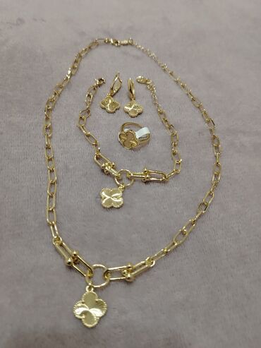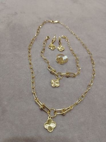 Qızıl rəng tonlarında zərif zərgərlik dəsti - Dəst tərkibi: boyunbağı, üzük və sırğalar - Boyunbağı: incə zəncir, asqısı yonca motivli; mərkəzdə iri parlaq daş, ətrafında kiçik daşlarla bəzək - Üz...