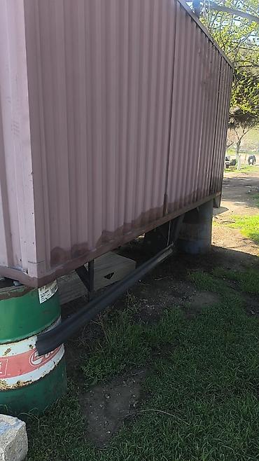 Metalkonstruksiya anbar/konteyner - Material: qalın metal lövhələrdən yığma, karkaslı - Üstü və ətrafı dalğalı təbəqə (şifer/profnastil) ilə örtülü sahədə yerləşir - Ölçülər təxmini: hündürlük ~2,...