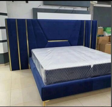 - Model 1: Tünd mavi rəngdə, geniş və heykəlsayağı başlıq. Başlıq boyunca qızılı dekorativ zolaqlar və ortada həndəsi panellər. Aşağı profilli baza, yumşaq tekstilli üzlük, metal qızılı ayaqlar. Müasir-lüks interyerlər üçün nəzərdə tutulmuş dizayn.