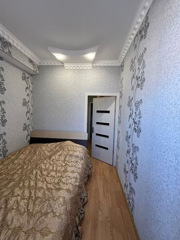 - Yataq otağı: dekorativ gips-karton tavan işıqları, klassik kartonpyer, naxışlı divar kağızları; laminat döşəmə; ikili yataq və ayrıca tək çarpayı yerləşimi üçün uyğun planlama.