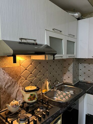 - Mətbəx: ağ rəngli müasir dolablar, metal tutacaqlar; quraşdırılmış qaz plitəsi (4 gözlü), aspirator, ikigözlü paslanmayan polad moyka; mərmər naxışlı iş masası və divar panelləri.