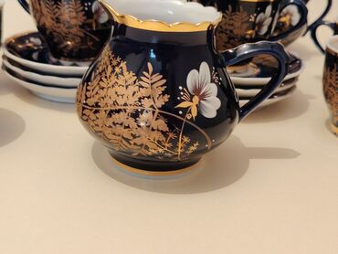 - Dərin lacivərd rəngdə porselen, əl işi qızılı ornamentlər və ağ çiçək motivləri