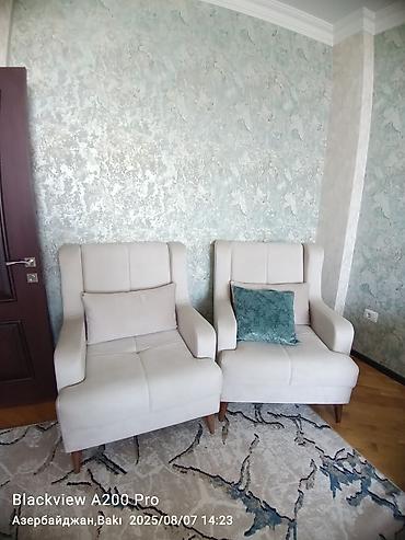 - Kreslolar: dərin oturuş, bel yastığı, taxta konus ayaqlar, dəstlə uyğun dekor yastığı