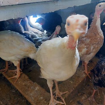 Hind toyuqları (indeykalar) - Şəkildə müxtəlif rəngli hind toyuqları görünür: qara-qəhvəyi tonlarda və ləkəli (qara-ağ) fərdlər. - Həm erkək, həm dişi quşlar mövcuddur; iri gövdəli, geniş döşlü və...