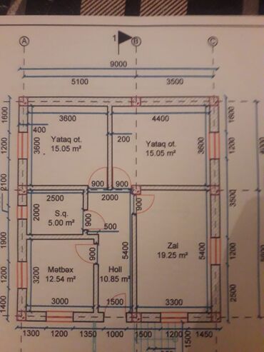 - Divar qalınlıqları və daşıyıcı elementlər sxemdə işarələnib.