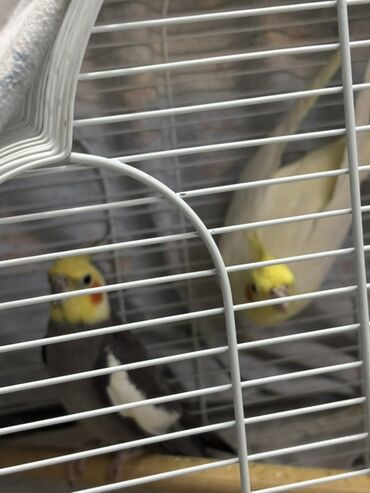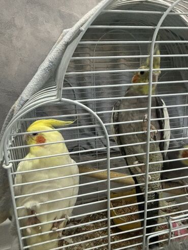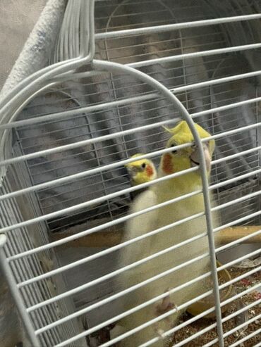 Ev quşları – Nimfa (Cockatiel) cütü və qəfəs dəsti - Növ: Nimfa (Cockatiel) papağanları, başda sarı çəlpələng, yanaqlarda narıncı ləkələr - Rənglər: biri boz-ağ-sarı qarışıq, digəri açıq sarı - Cü...