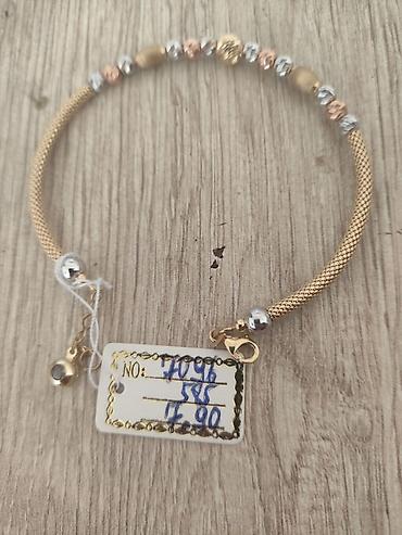 585 probalı qızıl detalı ipli bilərziklər seti..mesaj bölməsinə ciddi olanlar yazsınlar yalnız. - Material: 585 probalı qızıl (etiketlərdə qeyd olunub) - Dizayn: incə qızıl muncuqlu ip; ortada yuv...