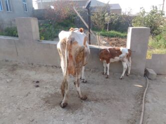 Satılır: inək 3aylığ erkək balası var - Cins: simental (şəkildə göründüyü kimi, qəhvəyi rəng, alnı açıq rəngli) - Buynuzlu, sakit xasiyyətli, otlaqda rahat güdülür - Sağım üçün münasib, süd və bu...