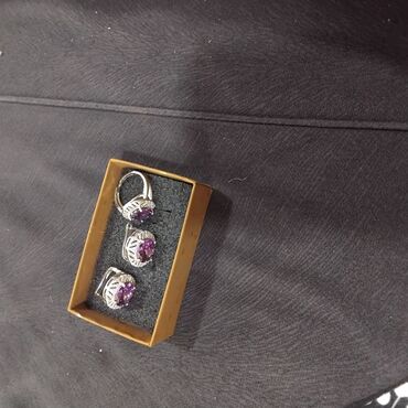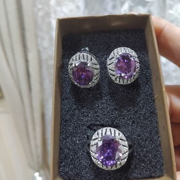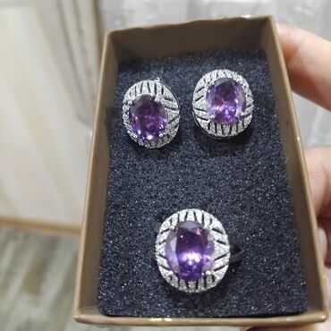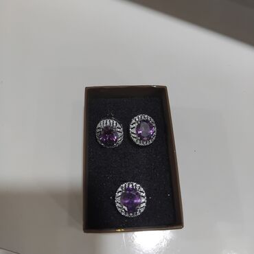5 li Gümüş dəst. 925 italyan əyarı. Təbii ametist daşı və ətrafı kiçik ölçülü cırkon daşlarla bəzdilmiş 1 cüt sırğa, üzük, sep və klon dəstindən ibarət zinət əşyası. Yenidir, hədiyyəlik qutusuda mö...