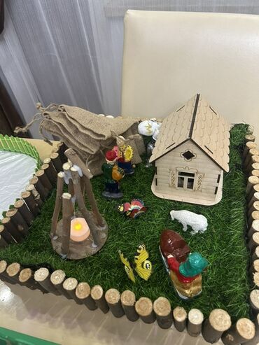 - 1 ədəd tematik dekor kompozisiyası: süni ot örtüyü üzərində taxta ev maketi, ocaq (LED şam işıqlı), mini fiqurlar, kətan torbacıqlar, kənarları təbii ağac çubuqlarla haşiyələnmiş kvadrat baza