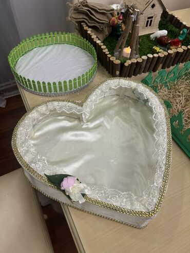- 1 ədəd ürək formalı xonça: atlas/parça içlik, kənarları incə krujeva və qızılı bəzəklə, küncdə kiçik çiçək dekoru