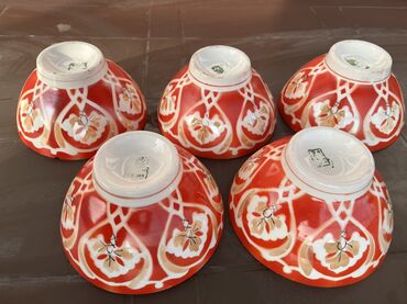 Qırmızı naxışlı keramik qab dəsti - Dəst: 5 ədəd balaca kasa - Material: keramika/porşelen tipli - Rəng və dizayn: parlaq qırmızı fon üzərində ağ və sarı ornamental naxışlar - Forma: klassik yuvar...