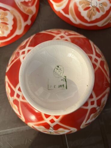 Qırmızı rəngli keramik/porsele nəlbəki-kasa dəsti. - Dizayn: biri iri ağ xallı (polka-dot), digəri əl işi kimi görünən ağ konturlu və narıncı-qırmızı naxışlı oriental motivli. - Material: şirəli k...