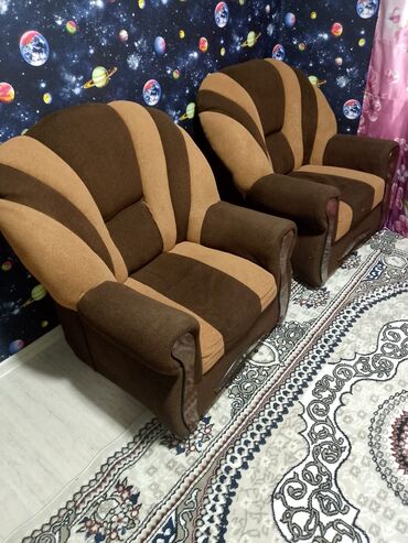 Künc divan dəsti - Forması: L şəklində künc divan - Rəng və dizayn: Tünd qəhvəyi oturacaq və karkas, krem rəngli floristik naxışlı iri bel yastıqları; uclarında eyni naxışlı dekorativ silindr yast...