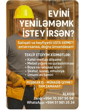 EvlərEvini yeniləmək istəyənlər üçün usta xidməti