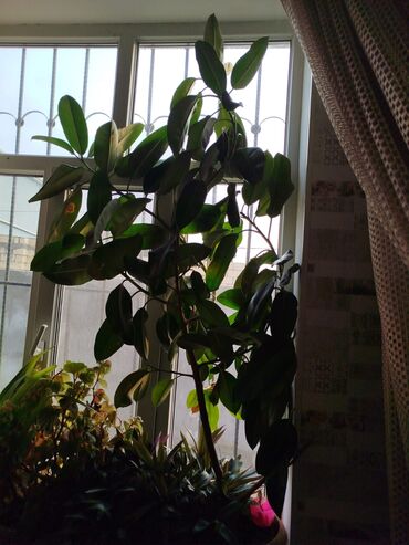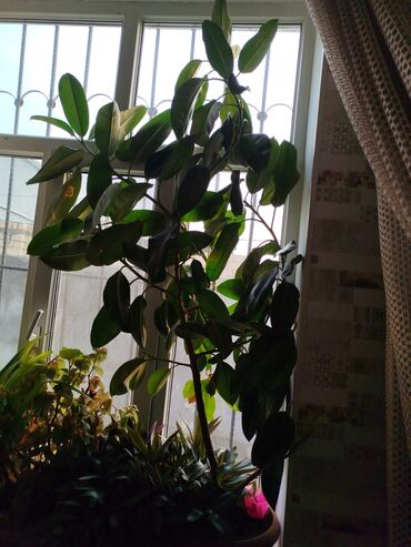 - Növ: Ficus elastica, iri, parlaq tünd‑yaşıl yarpaqlı dekorativ ağac tipli bitki