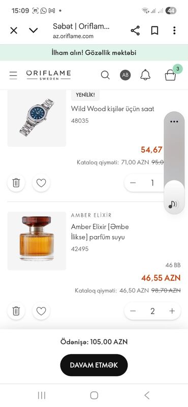 Əlavə məhsul şəkillərində: Amber Elixir parfüm suyu (kod 42495) kataloq qiyməti 46.50 AZN, 46 BB. Ayrıca Giordani Gold Essenza parfüm qutusu görünür.