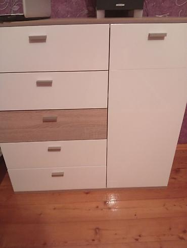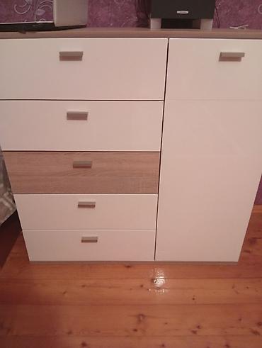 Ağ rəngdə kompakt komod/dolab: - 4 ədəd çəkmece + 1 qapılı bölmə - Sadə, minimal dizayn, qara düymə tutacaqlar - Üst hissə dekor və gündəlik əşyalar üçün genişdir - Yataq otağı, qonaq otağı və dəhl...