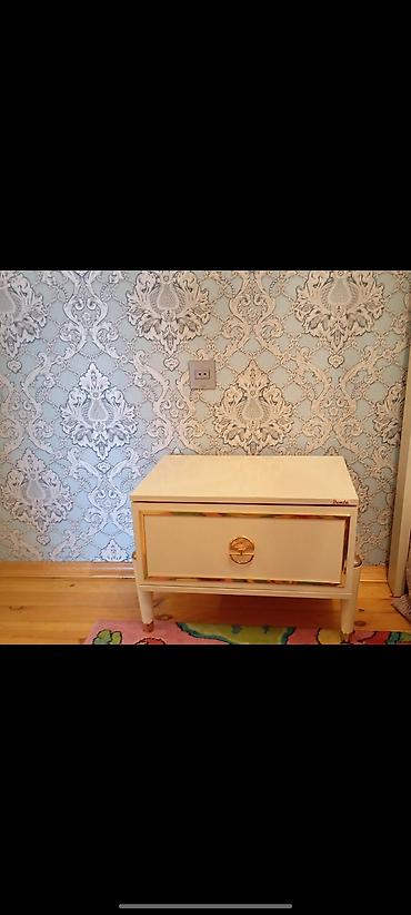 - Dəstlə birlikdə tumba: Açıq krem rəng, qızılı haşiyəli ön panel, dairəvi qızılı qolbaq formalı tutacaq. 1 ədəd dərin çekmece. Hündür ayaqlı konstruksiya, təmizləmə və hava dövranı üçün rahat.