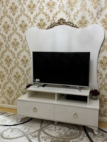 - TV stendi: ağ rəng, qızılı halqa tutacaqlar, 2 qapalı çekmece + 2 açıq rəf (konsol/TV qutusu üçün uyğundur), dalğavari üst panel və klassik ornament.