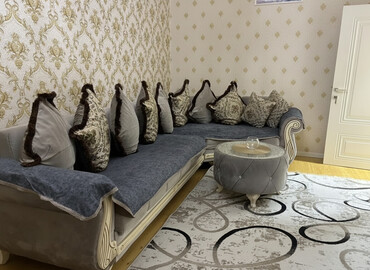 - L formalı yumşaq künc divan: geniş oturma yeri, dekorativ oyma yanlıqlar, bozumtul/bez rəng tonları; çoxsaylı iri dekor yastıqlar.