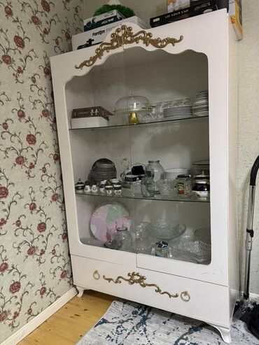 - Vitrin şkafı: 2 şüşə qapılı, 2 mərtəbəli şüşə rəf, aşağıda geniş çekmece; ağ korpus, qızılı dekor elementləri və halqa tutacaqlar.