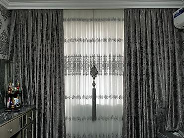 - Material: Ağ tül üzərində gümüşü-boz naxışlı ornementlər və qalın, ağır toxumalı boz-simit rəngli blackout/perde.