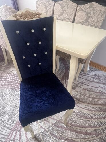 - Bir stul tünd göy məxmər/parça örtüklü, digərləri açıq bej naxışlı parça ilə