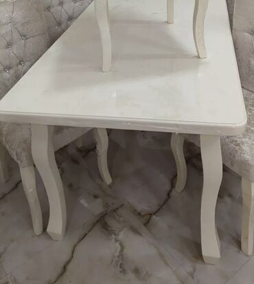 - Masa: Krem/ağ rəngdə, parlaq səthli, yumşaq radiuslu künclər, oyma formalı S-şəkilli ayaqlar; stabil və zərif görünüş