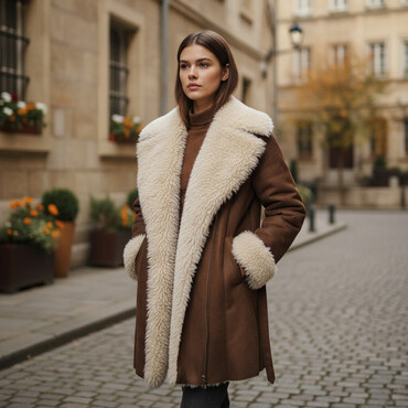 Qadın palto – klassik qəhvəyi tonlarda, dizə qədər uzunluq. Xüsusiyyətlər: - Geniş, yumşaq tük/quzu yaxalıq (çıxarılan deyil – düyməli yaxaya bərkidilib) - Ön hissədə düyməli bağlanma - Eyni mater...