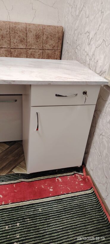 - Sağ tərəfdə qapılı şkaf və üstündə kilidli çekmece – materialların təhlükəsiz saxlanması üçün.