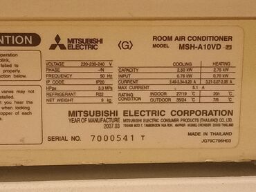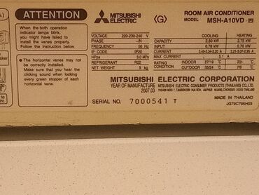 Mitsubishi Energy Room Air-conditioner – Split tipli otaq kondisioneri Texniki göstəricilər (etiketdəki məlumatlara əsasən): - Model (daxili/xarici blok): GE 0921 - Gərginlik: 220–240 V - Tezlik: ...