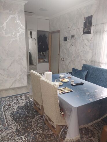 - Açıq mətbəxli geniş qonaq otağı: L formalı müasir mətbəx mebeli, qara mərmər üslubunda stolüstü, qaz plitəsi, aspirator, qabyuyan üçün yer, qara kran və dərin lavaboyla. Metrolit ağ “metro” kafel arası, çoxsaylı yuxarı-aşağı dolablar, künc bölmələri. Soyuducu, yemək masası, 2 ədəd yumşaq oturacaq və divan. Dekorativ mərmər effektli divar kağızı, gərginlik işıqları, laminat döşəmə, xalça.