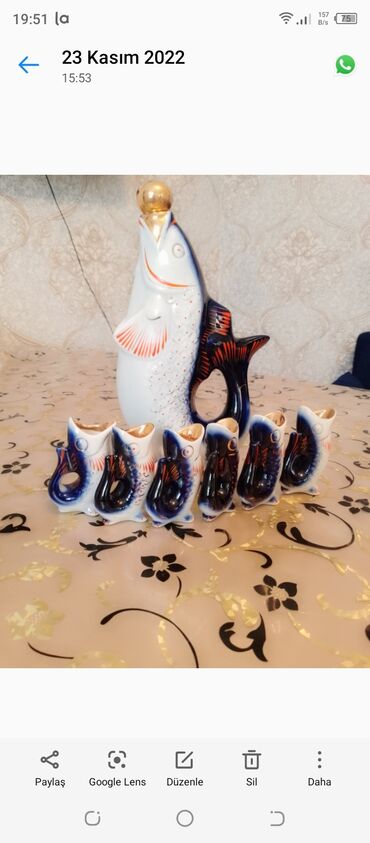 - Komplekt: 1 böyük balıq formalı qrafin + 6 ədəd kiçik balıq formalı stəkan.