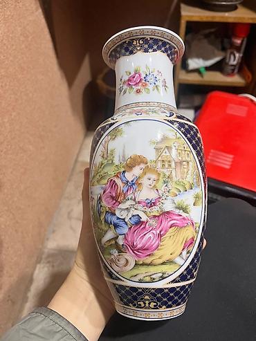 Böyük dekorativ porselen vaza - Material: cilalı ağ porselen - Forma: enli kürəvi gövdə, ensiz uzun boyun, geniş kənarlı ağız - Bəzək: əl işi üslubunda çoxrəngli rəsmlər və qara xəttlə yazılmış Çi...Giriş•Qeydiyyat