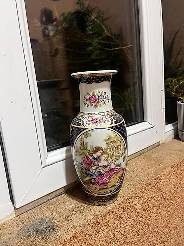 Klassik üslubda dekorativ vaza - Material: keyfiyyətli keramika/porcelan gövdə, metal/qızılı tonlarda dekorativ tutacaqlar və dayaq. - Dizayn: oval gövdədə əl işi təsvirli, rokoko motivli səhnə; g...