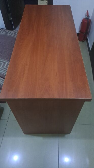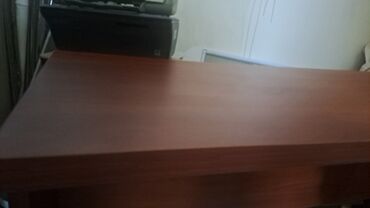 Ofis masası – tünd qəhvəyi rəngdə, geniş iş səthi ilə. - Material: laminat/LDSP tipli taxta səth, hamar və asan təmizlənən. - Ölçü təxmini: uzunluq ~150–160 sm, dərinlik ~70–80 sm, hündürlük ~75 s...