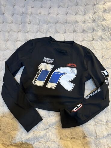 1) Qara uzunqol crop top – ön hissədə iri “TR” yarış üslublu qrafika və yazılar, qol hissələrində də çap detalları. Dairəvi yaxa, bədənə oturan kəsim, elastik material.